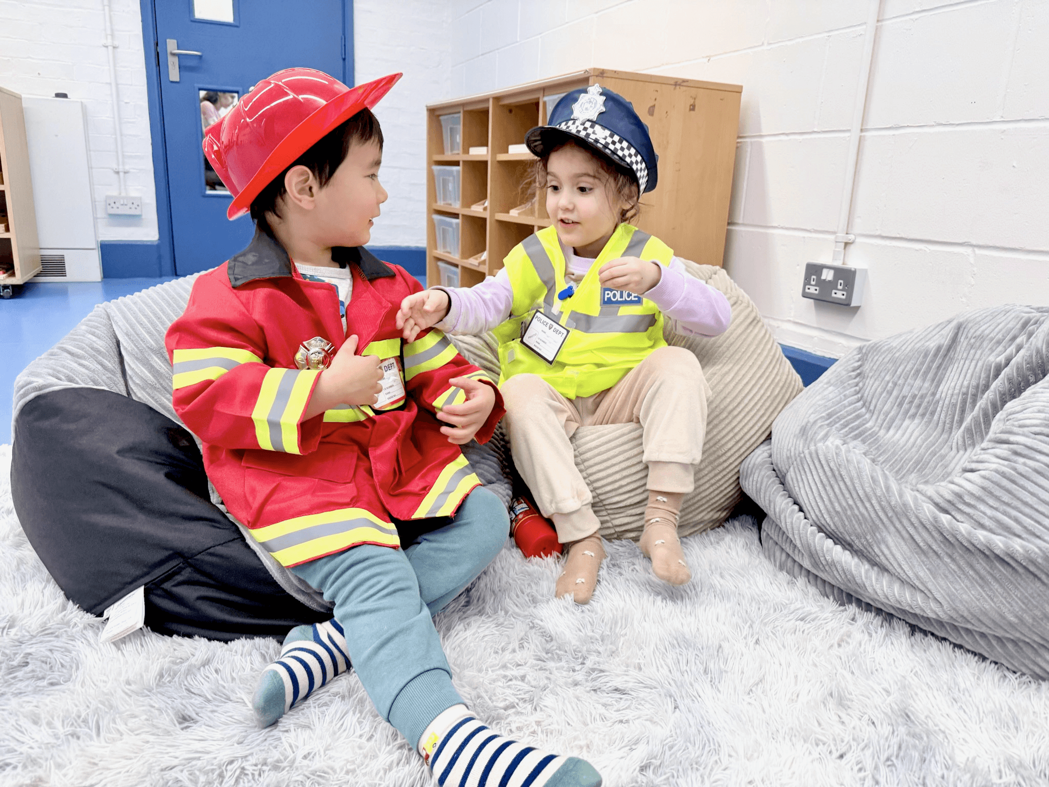 Mixed-age groups encourage older children to model language use for younger ones, while teachers provide descriptive praise and emotional coaching, fostering communication skills, self-confidence, and a love of learning in both languages.